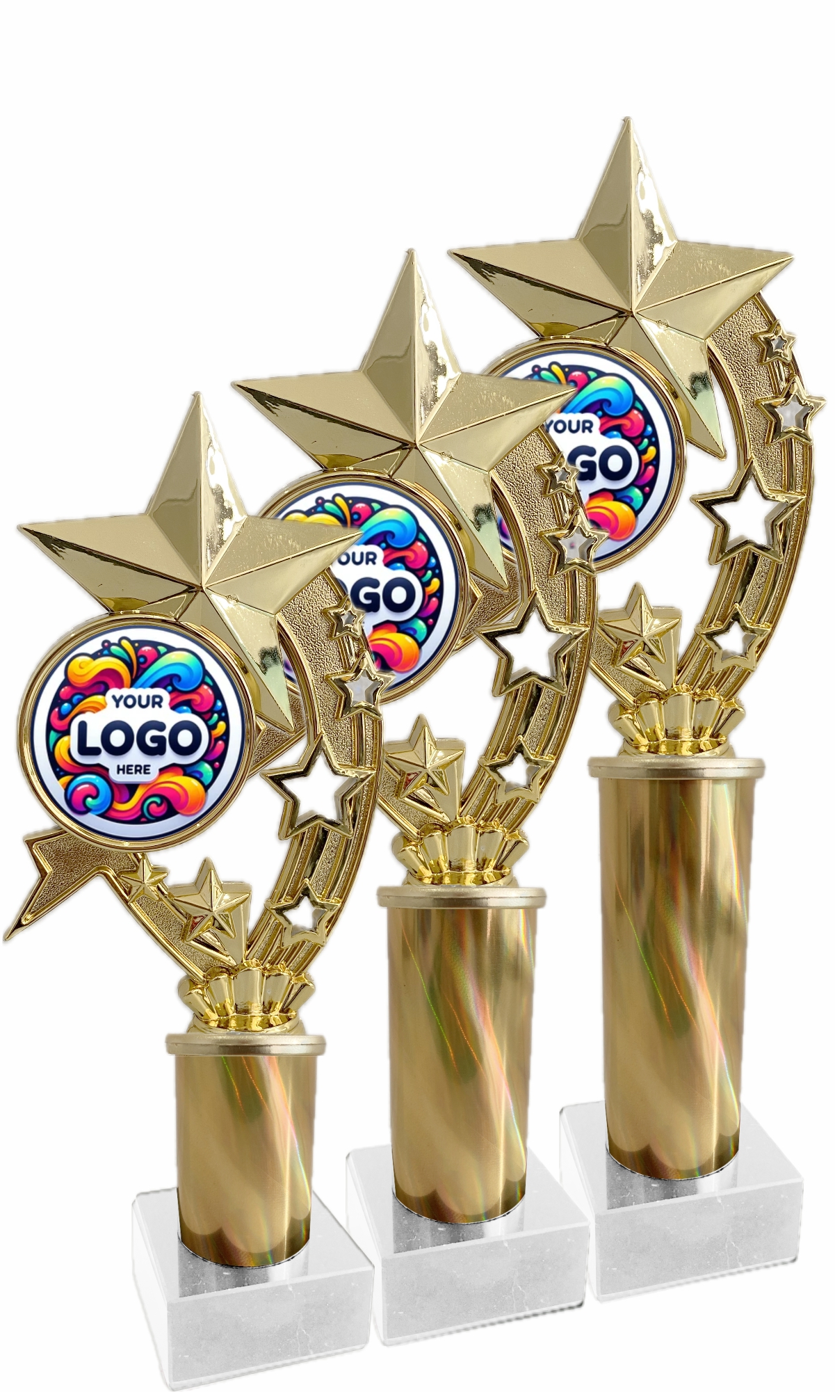 Gold Superstar Holder Trophy on Column (Including Domed Insert) on White Marble Base